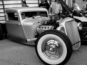 1935 Ford Pickup ratrod owned by Lucky-U Cycles on display at Leesburg Bikefest 2010. A friend of mine has one that is very similar, though more ratty than hotrod. It's bad enough that your knees are against the dash while hunched over to keep from hittin' your head against the roof, but you are literally three inches from the pavement in something that has no rear suspension (the rear end is bolted directly to the frame) and has chopped front leaf springs. About the only modern convenience either of them has is...uhhhhh....yeah, I'll have to get back to on that one. Hell, as long as it looks cool, who gives a shit what it rides like.